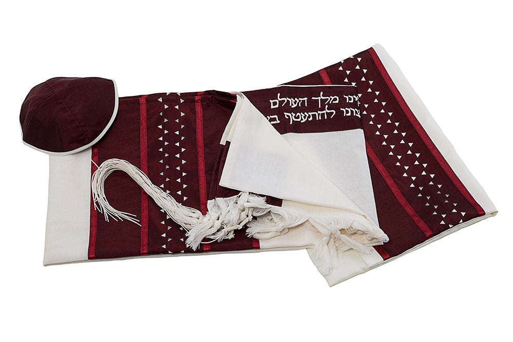 The design is repeated on the Tallit bag and the Kippah has a matching color.